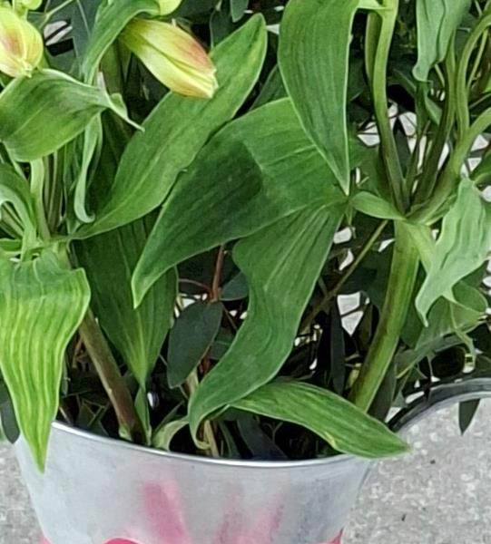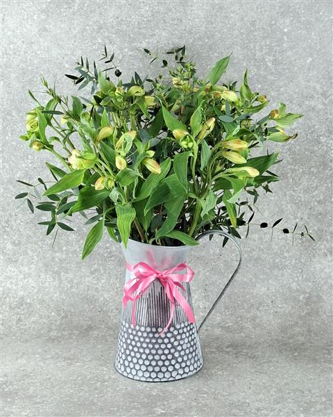 Featuring delicate but long lasting Alstromeria blooms arranged with foliage in a timeless metal jug.