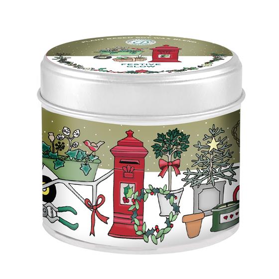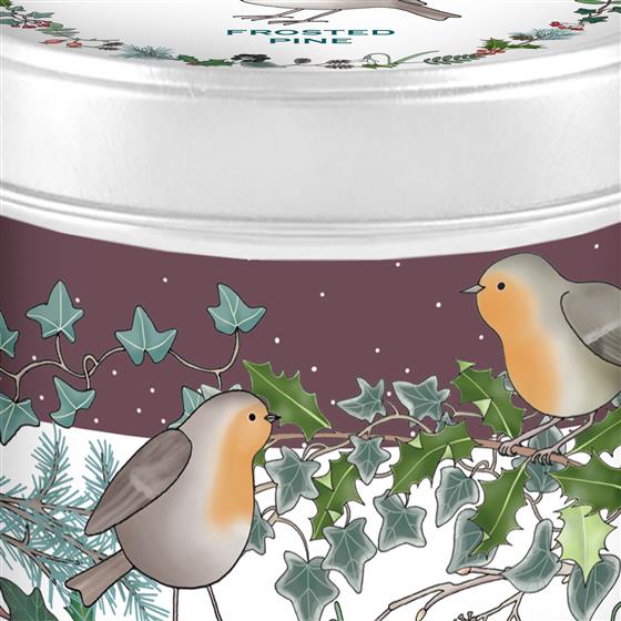 Beautiful candle tin featuring a Christmas scene by Emma Lawrence 30/35 hours burn time, British made, GMO free, Palm oil free, Vegan friendly.