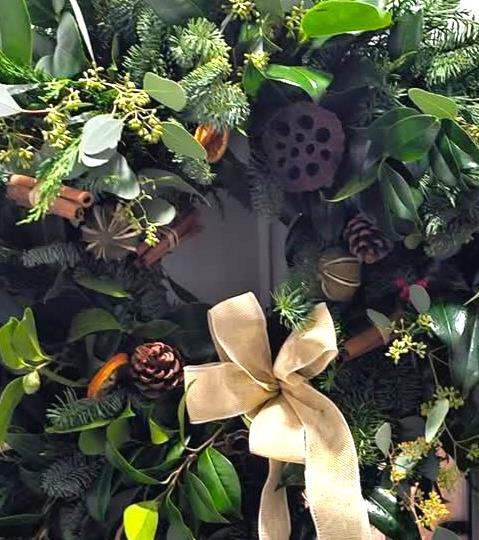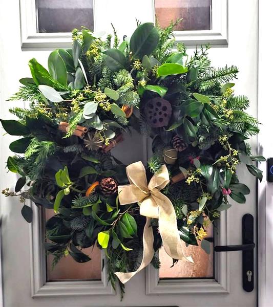 Our large door wreath beautifully decorated and finished with a beautiful bow. Made with a mix of foliage including spruce this wreath is creates a wonderful festive welcome.