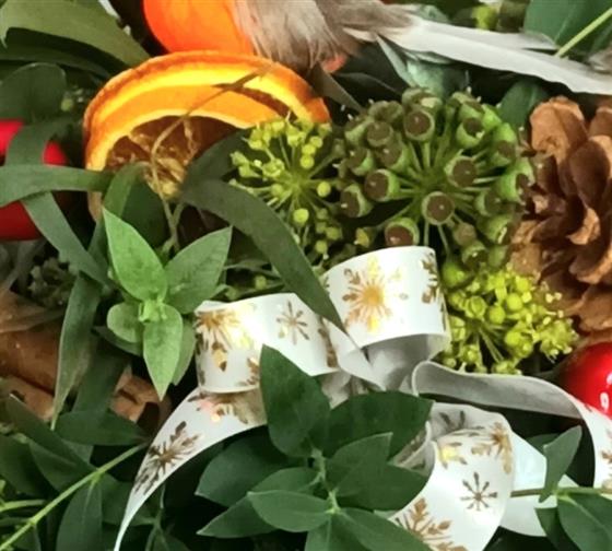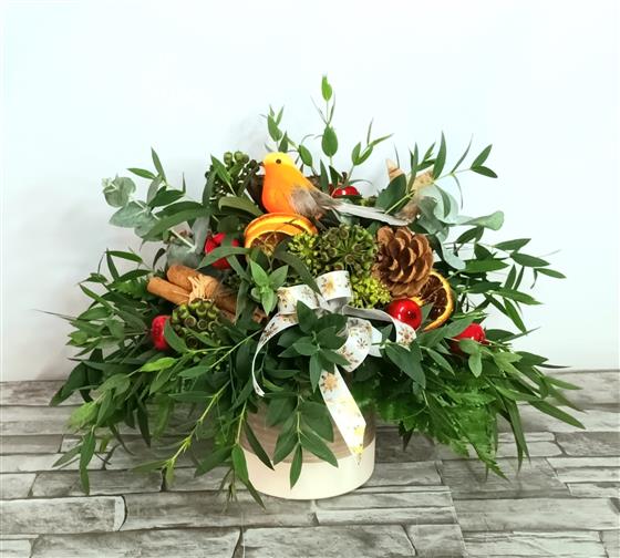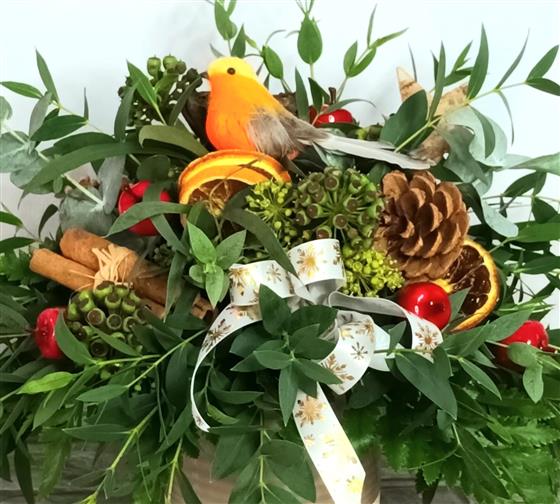 A cute Robin sits nestled amongst scented spruce, eucalyptus and mixed seasonal foliage. Made into a ceramic container, orange slices, cinnamon, cones and a Christmas bow complete the design.