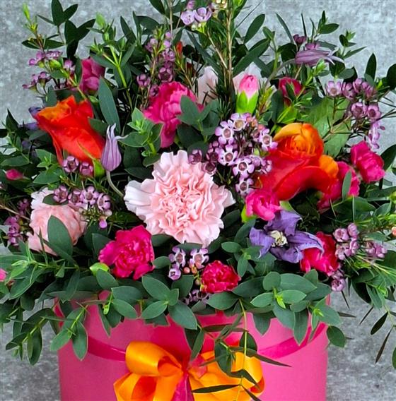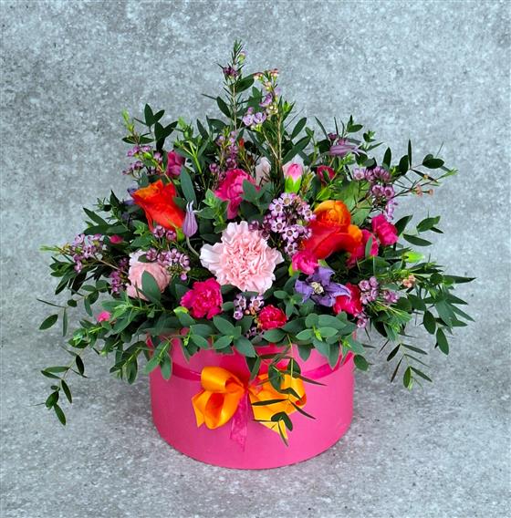 Mia is a beautiful bright hat box arrangement filled with vibrant blooms a beautiful Mother's Day gift your mum would be delighted to receive.