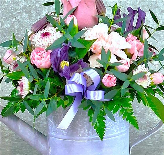A cute petite pastel arrangement in a zinc watering can container, a unique Mothers Day gift
