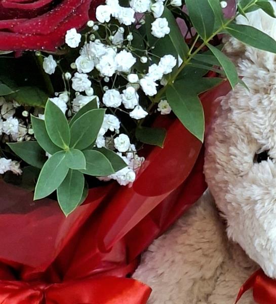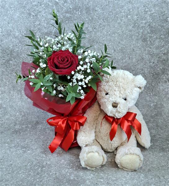 A beautiful red rose with gyp and foliage in a vase & the cuddly "Chandler " teddy bear completes this lovely Valentines gift.